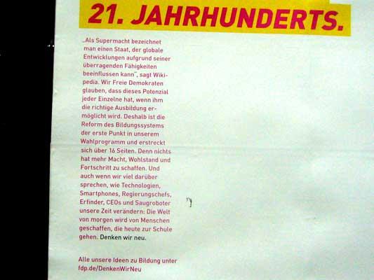 HK Mit diesen Formulierungen richtet sich auch Christian Lindner gegen den Stillstand und das Aussitzen wichtiger Probleme bei der GroKo-Regierung von Angela Merkel. Lindner ist mit Sicherheit ein intelligenter vergleichsweise junger Mann, der es wohl im beharrlichen Alleinkampf geschafft hat, die FDP wieder zum Leben zu erwecken. In der Wahlwerbung setzt die FDP deshalb auch nahezu ausschließlich auf die Person Christian Lindner - so wie die CDU auf Angela Merkel setzt. Von den restlichen Parteimitgliedern erfährt man fast nichts - seien sie nun gut oder schlecht. Spannend, ob er auch das Zeug hat, eine Angela Merkel mitsamt ihrer konservativen Partei anzutreiben. Bedenklich ist jedoch, dass beide Parteien dem Lobbyismus sehr zugänglich sind (mit beträchtlichem Erfolg bei den Großspenden), so dass eine Einflussnahme von außen nicht ganz unwahscheinlich ist.